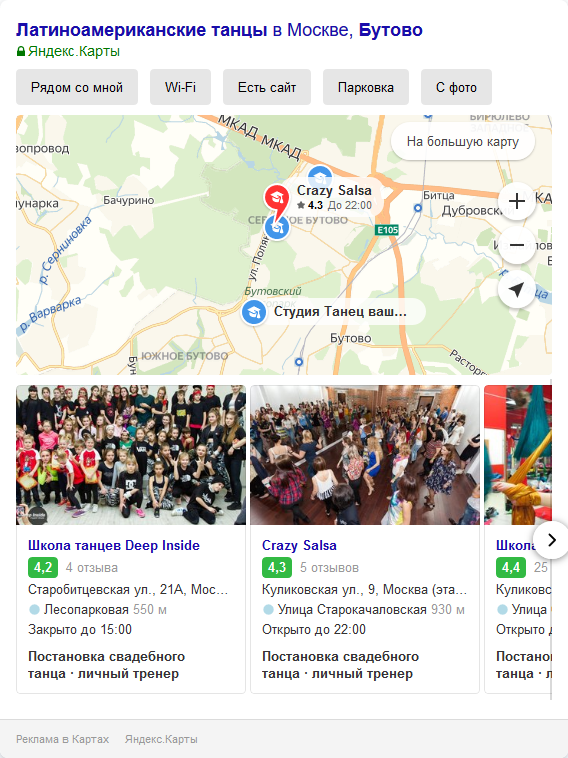 9 действующих филиалов в Москве - безусловный плюс для продвижения в рамках тяжелой московской конкуренции. Более того, это возможность охватить больше целевой аудитории в локальном поиске. Если потенциальный клиент ищет "танцы в Бутово", то он явно выберет локацию поближе, а не танцевальную студию в границах садового кольца.