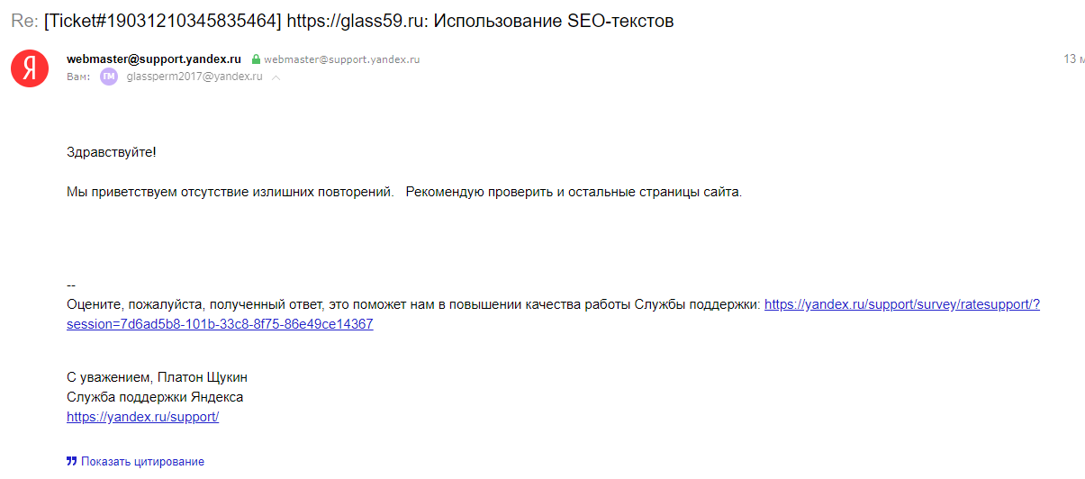 Это вообще отдельная тема так как общение продолжалось очень долгое время. Как мы все знаем тех. поддержка Яндекса не отличается точностью, так и в этот раз никакой конкретики, только общие фразы с тонкими намёками на причины фильтра…очень тонкими. В общей сложности было отправлено порядка 30 писем. Тексты были удалены, но фильтр не был снят, а тех. поддержка продолжала отвечать: