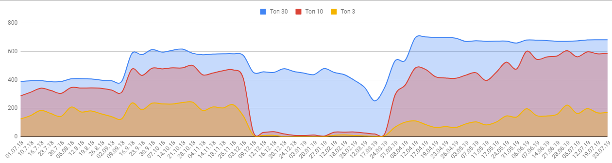 После наполнения сайта и проведения работ по СЕО удалось достичь вывода 81% запросов в ТОП10 Яндекса. 624 запроса из 771 отобранных.