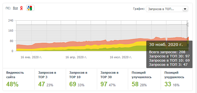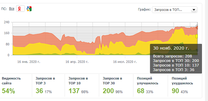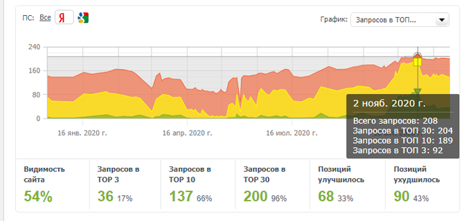 По окончанию работ и нескольких месяцев обновления поисковой выдачи получили следующие результаты: