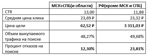 Также, через пару месяцев работы пришли к выводу, что при прочих равных (объем трафика, CTR, цена клика), трафик с кампании по всей РФ намного проигрывает трафику с кампании на МСК + СПБ.