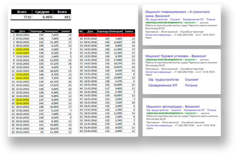 Вакансия Водитель - по этой вакансии пришлось конкурировать с партнерами агрегаторов такси. Стоимость перехода оказалась слишком высокой (до 52 рублей за переход). Приняли решение ограничить объем трафика по вакансии - убрать объявления с поиска, оставив только объявления в сетях, и вышли на стоимость перехода в 8 рублей.